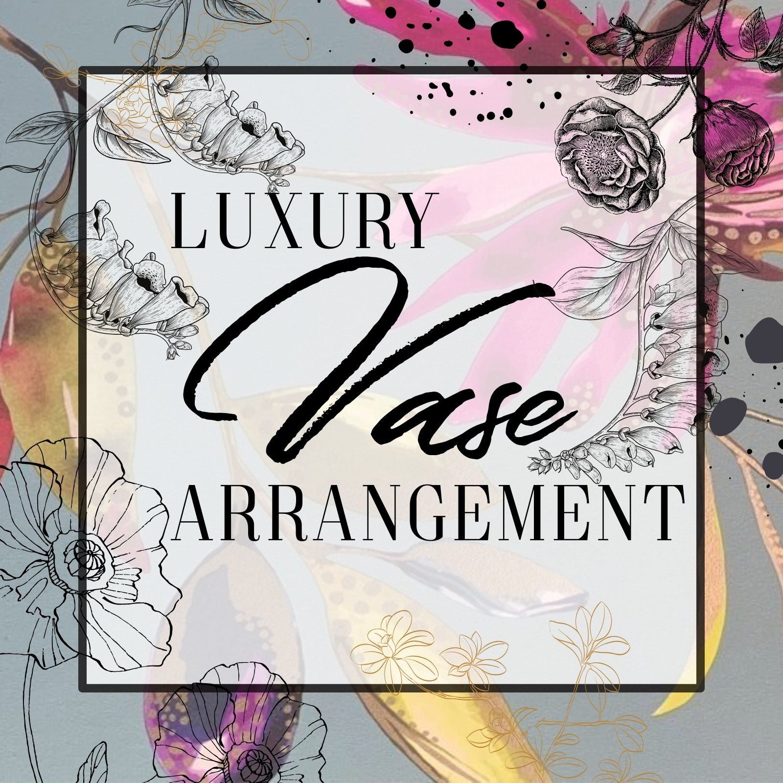 Decorative image with 'Luxury Vase Arrangement' text surrounded by floral designs on a colorful background.