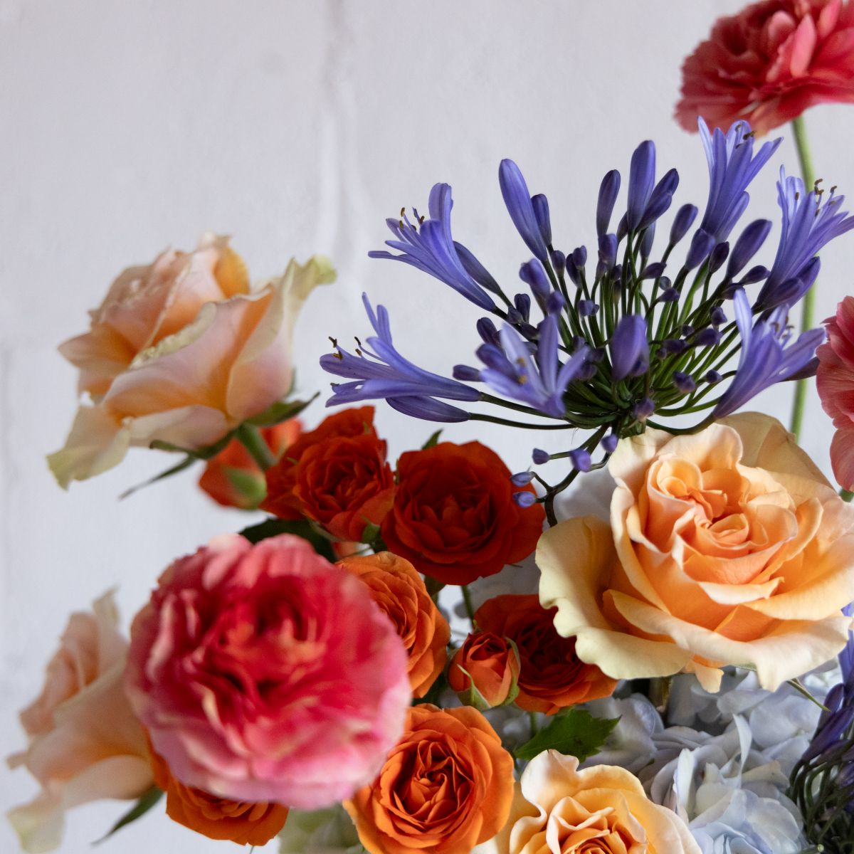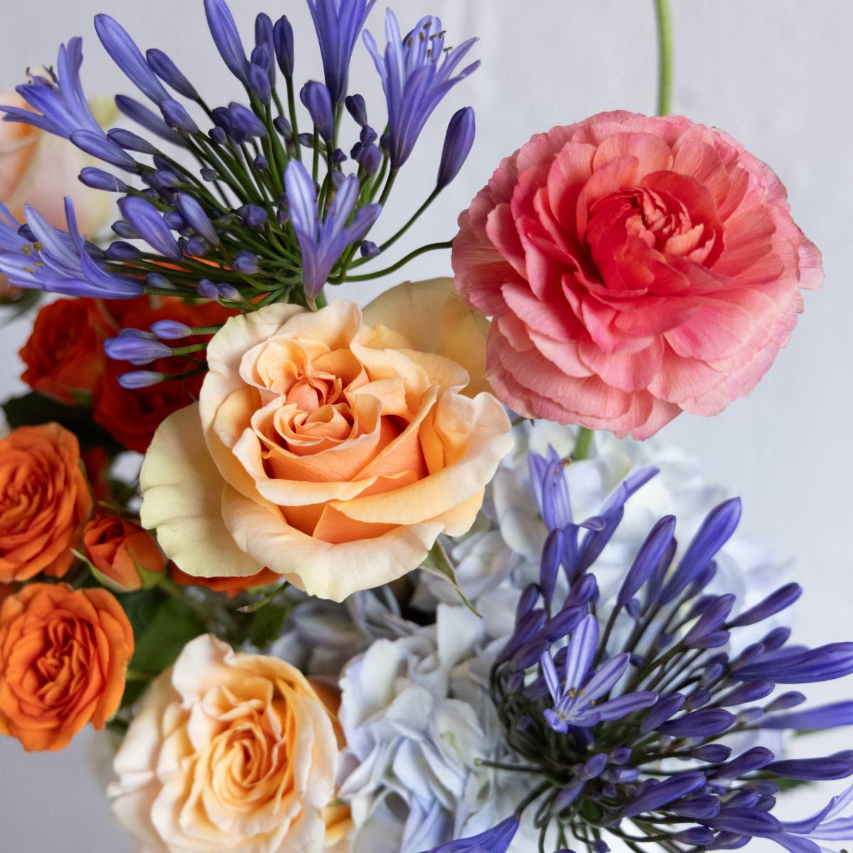 Bouquet of colorful flowers including roses and agapanthus on a light background