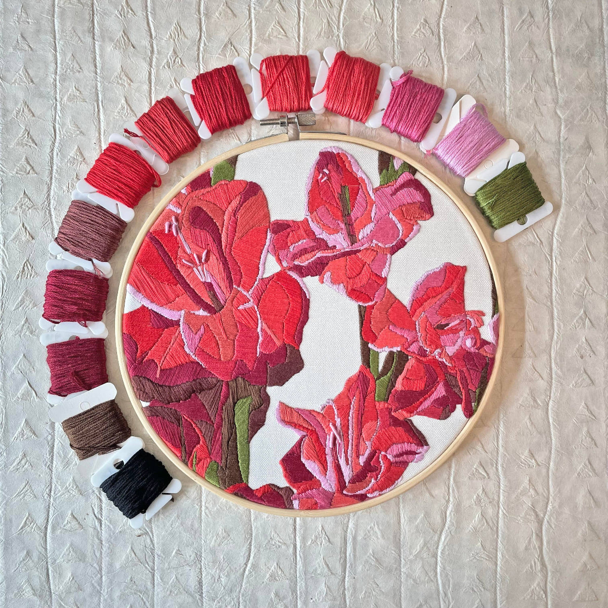 Settle in with a calming embroidery project inspired by fresh finds from the farmer's market. This 8" beginner-friendly kit features a tall stalk of red and pink gladiolus blooms—bold, layered, and full of natural movement—brought to life with 13 rich DMC embroidery floss colors.