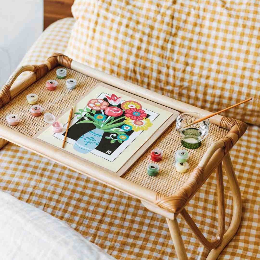 Adapting Mary’s illustrations for paint-by-number means that fans—both new and old—can experience and interact with her art in a new way. Engelblooms features a bouquet of Mary Engelbreit’s distinctive flowers—whimsically arranged in a sweet blue vase with a floral folk art pattern. The preprinted portion sets these blooms against a black background and buttery yellow border.