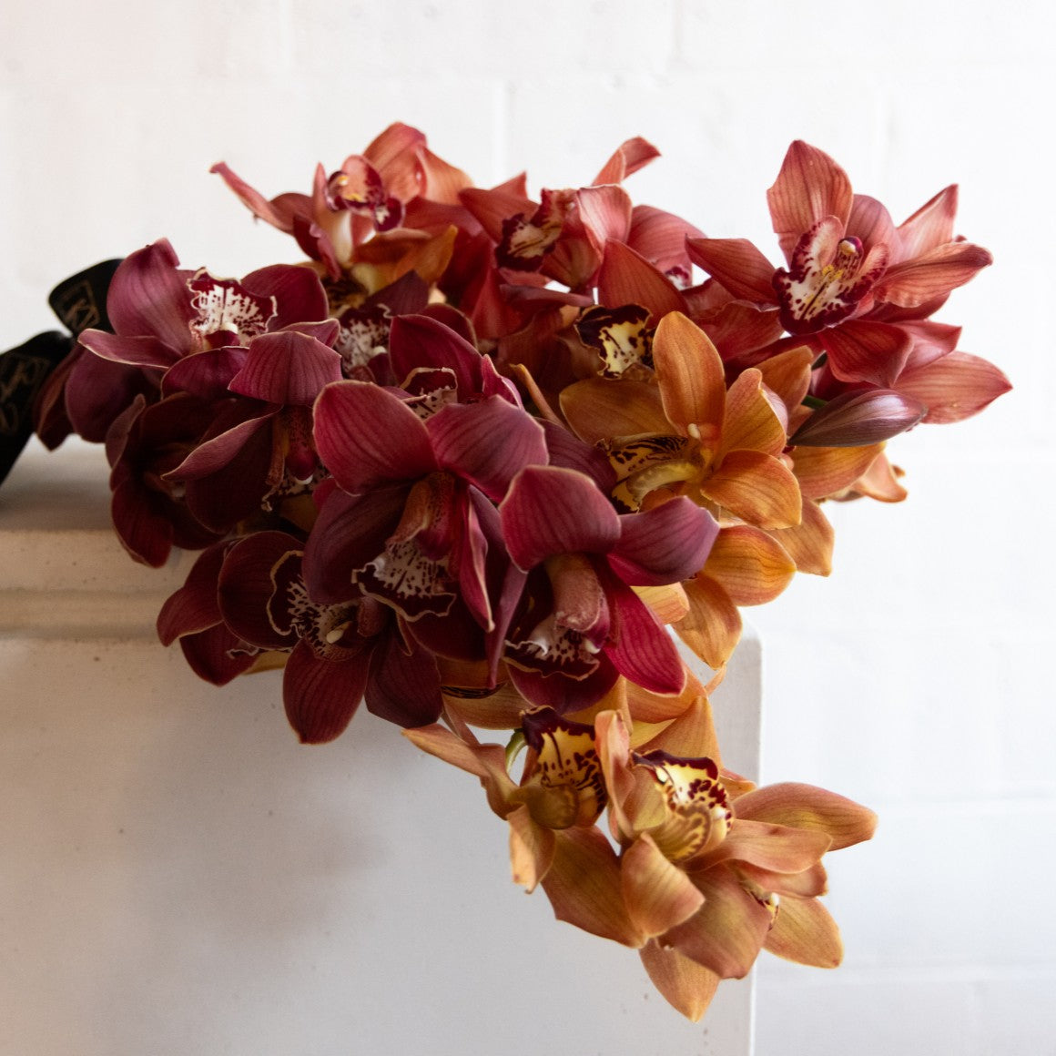 Experience pure luxury with this exquisite hand-tied bouquet featuring premium cymbidium orchids in stunning autumn tones. This sophisticated design showcases an abundant collection of burgundy and golden-bronze cymbidium orchids, expertly arranged to create a lush, rounded bouquet that exudes elegance and refinement. Tied with elegant black ribbon, this is a gift that makes an unforgettable impression.
