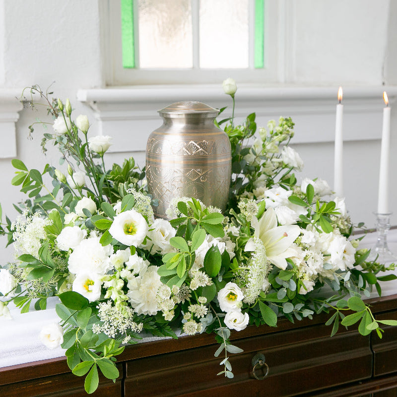 Sympathy Arrangement for Urn | White & Green Funeral Flowers