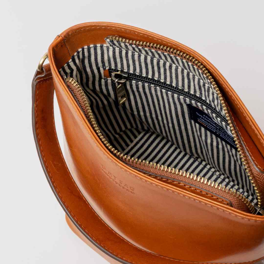Leather Bag Bobbi Bucket Midi | Cognac Classic Leather | This classy bucket bag has one roomy interior and a slip-in pocket to grab your small essentials in a sec. It comes with an adjustable/removable shoulder strap, antique brass hardware and one large inside compartment.